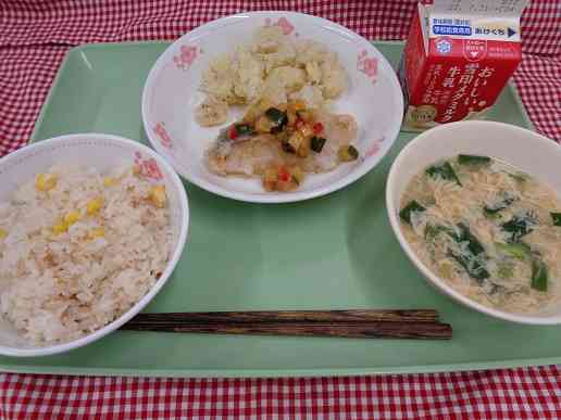 牛乳 とうもろこしご飯 メルルーサのマリネ じゃがいもの香味和え にらたまスープ