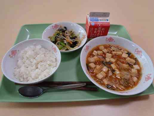 牛乳 ご飯 豚キムチ豆腐 もやしとわかめのごま醤油