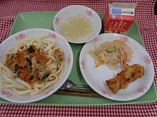 牛乳 冷やしうどん ちくわの粉チーズ天ぷら はりはりゆで野菜 アップルゼリー