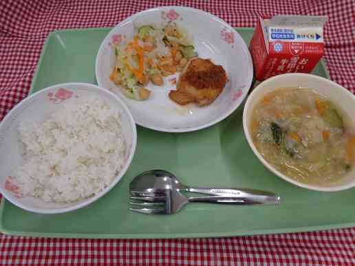 牛乳 ごはん 鶏肉のバーベキューソース ひよこ豆いりゆで野菜 キャベツとベーコンのスープ