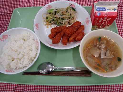 牛乳 ご飯 いかのケチャップ和え 青菜とじゃこのゆで野菜 ビーフンスープ