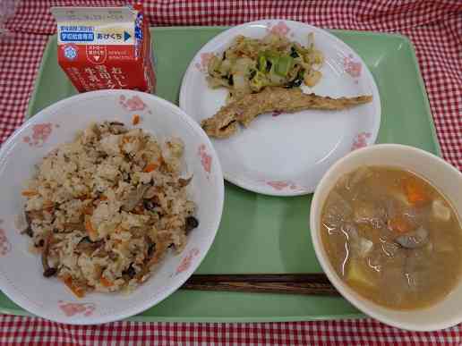 牛乳 きのこごはん ししゃものごま天ぷら ゆで野菜 さつま汁