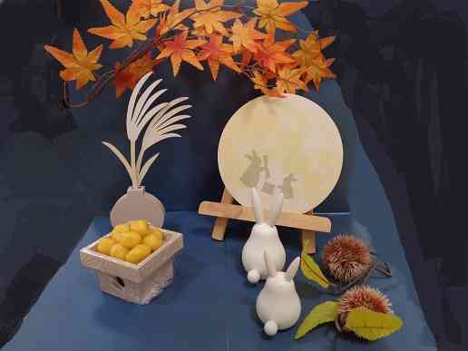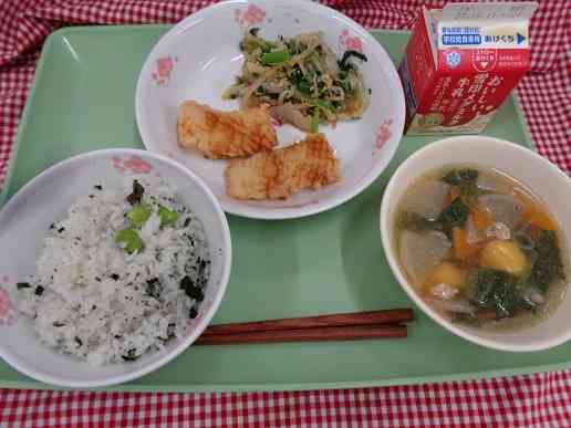 牛乳 枝豆ご飯 いかのたつた揚げ ゆで野菜 お月見団子汁 今日はお月見メニューです。 かぼちゃの生地でお団子を作りました。