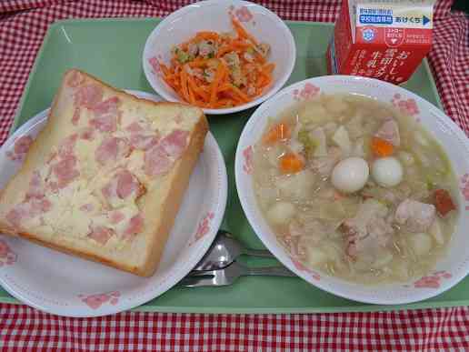 牛乳 ハムチーズトースト ポトフ にんじんとツナのゆで野菜