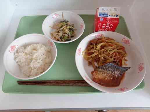 牛乳 ご飯 さばの味噌煮 カレーきんぴら ゆで野菜