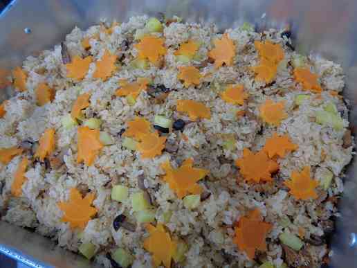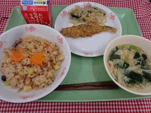 牛乳 秋の香ご飯 ししゃもの香味揚げ ゆでやさい かきたま汁 秋の香ご飯はたくさんの人参を紅葉の型抜きでつくり飾りました。さつまいもも甘く秋の味覚を楽しみました。