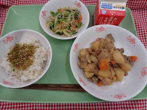 牛乳 ごはん ふりかけ 肉じゃが 小松菜の和え物
