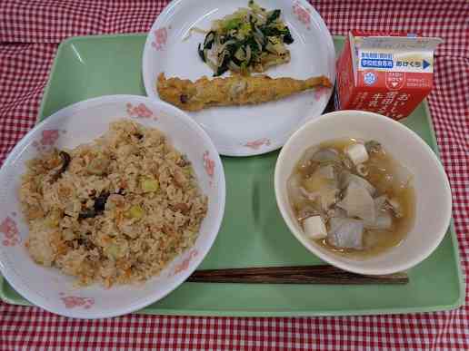 牛乳 炊き込みご飯 ししゃもの紅葉揚げ 磯香和え けんちん汁