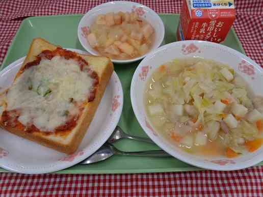 牛乳 ピザトースト インゲン豆入り野菜スープ アップルゼリー
