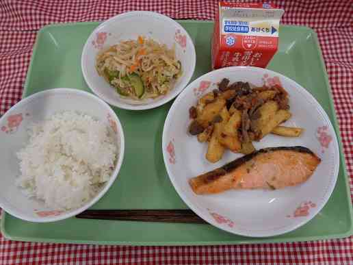 牛乳 ごはん 鮭の香味焼き じゃがいものきんぴら炒め カミカミ和え