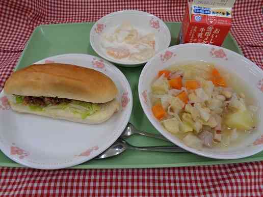 牛乳 焼肉ドッグ インゲン豆入り野菜スープ フルーツのヨーグルト添え