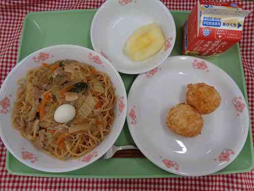 牛乳 あんかけ焼きそば チーズじゃが丸 りんご