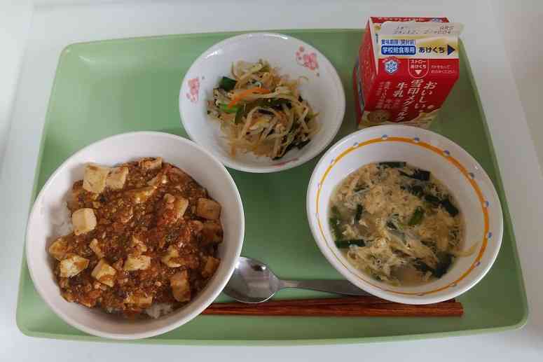 牛乳 麻婆丼 もやしとわかめのごま醤油 にらたまスープ