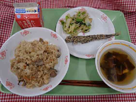 牛乳 五目とリ飯 ししゃもの石垣揚げ ゆで野菜 すまし汁