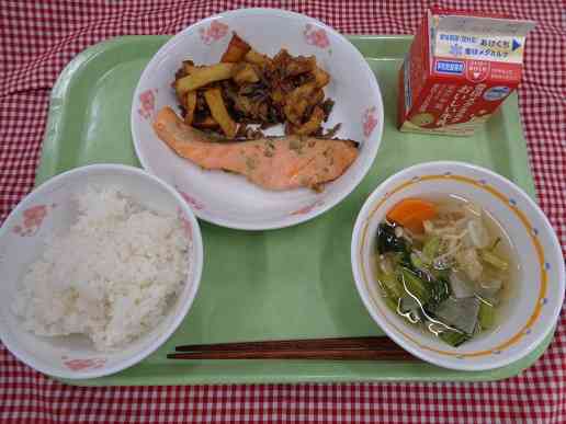 牛乳 ご飯 鮭の香味焼き じゃがいものきんぴら炒め 野菜のすまし汁