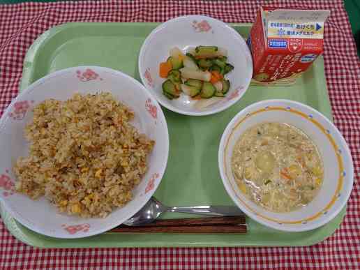 牛乳 じゃこ炒飯 華風甘酢 たまご入りコーンスープ