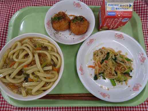 牛乳 カレーうどん ポテトたこあげ こまつなのあえもの