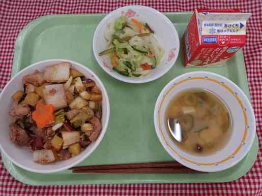 牛乳 カラフルやきとり丼 海藻入りゆで野菜 なめこ汁