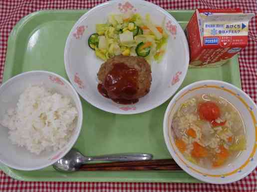 牛乳 ご飯 タイムカプセルハンバーグ じゃがいも入りゆで野菜 ABCスープ