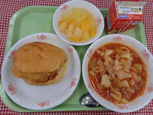 牛乳 フィッシュバーガー ミネストローネスープ フルーツポンチ